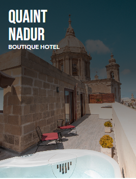 Quaint Boutique Hotel Nadur is located behind the Church in the main square of the village of Nadur. The hotel consists of twelve rooms. All rooms are air conditioned and come with a flat-screen TV, tea and coffee facilities, free toiletries, in-room safe, and a desk. Some of the rooms contain a jet-tub and one of the rooms contains an outdoor whirlpool jacuzzi. The hotel offers an a-la-carte breakfast. The property has a pizzeria and a restaurant, both with outdoor seating.